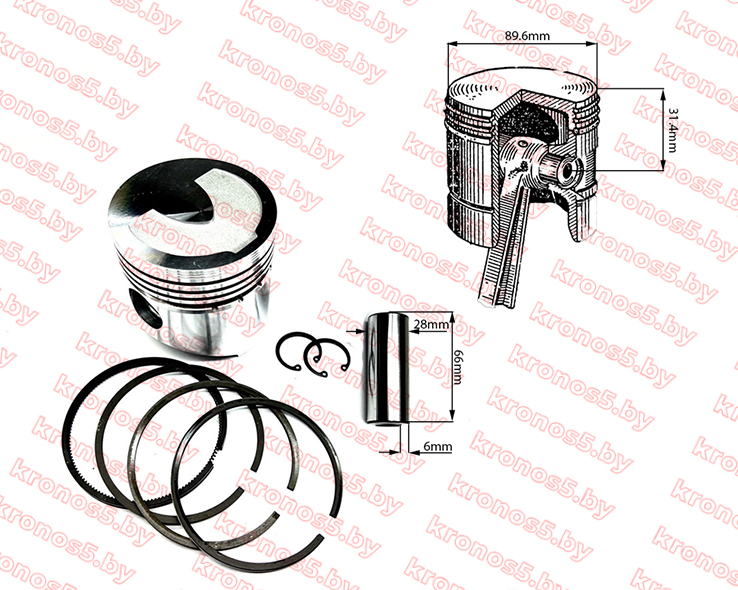 Комплект состоит из: - Поршень — 1 шт. - Поршневой палец — 1 шт. - Стопорные кольца пальца — 2 шт. - Поршневые кольца — 3 шт. - Маслосъёмное кольцо — 1 шт. - Гильза — 1 шт. - Манжеты гильзы — 2 шт. - Прокладка ГБЦ — 1 шт.